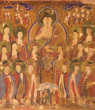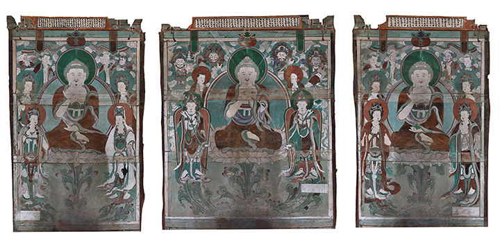 선운사 후불벽화는 대웅보전에 있는 조선후기 불화로 중앙에는 비로자나불회도 아비타불회도, 약사여래불회도 벽화가 남아있습니다. 우리나라에서 가장 큰 후불벽화이며 주요 화승으로는 원담내원과 익찬 등이 참여한 것으로 알려져 있습니다.