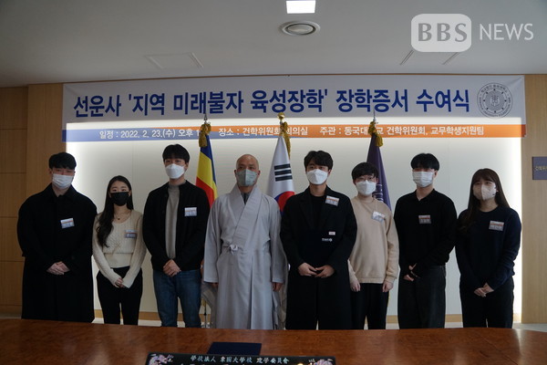 동국대 건학위원회는 오늘 동대 건학위 회의실에서 '선운사 지역미래불자육성장학 장학증서 수여식'을 열고 전북 고창과 순창, 군산 등에서 선발된 학생 10명에게 각 100만 원씩 총 1000만 원을 지원했습니다.