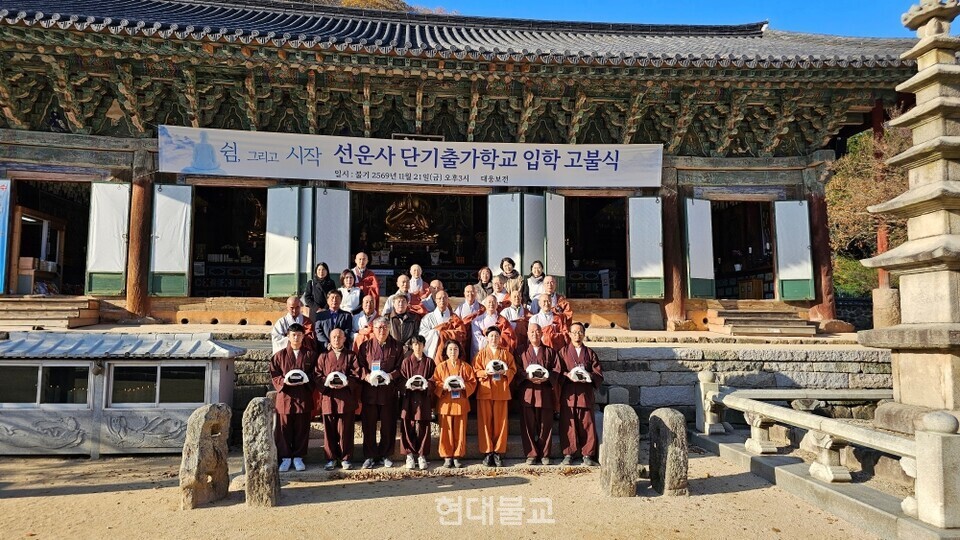 대웅전에서 봉행된 고불식에서 주지 경우스님은 격려사를 통해 “단기출가학교는 단순히 걸에 머무는 체험이 아니라 스스로를 돌아보고 마음의 본래 자리를 찾아가는 수행의 길”이라며 “열흘간의 짧은 일정이지만 평소에 미처 보지 못했던 자신과 마주하고 잊고 지냈던 마음의 고요와 자비를 되새기게 될 것”이라고 말했다.